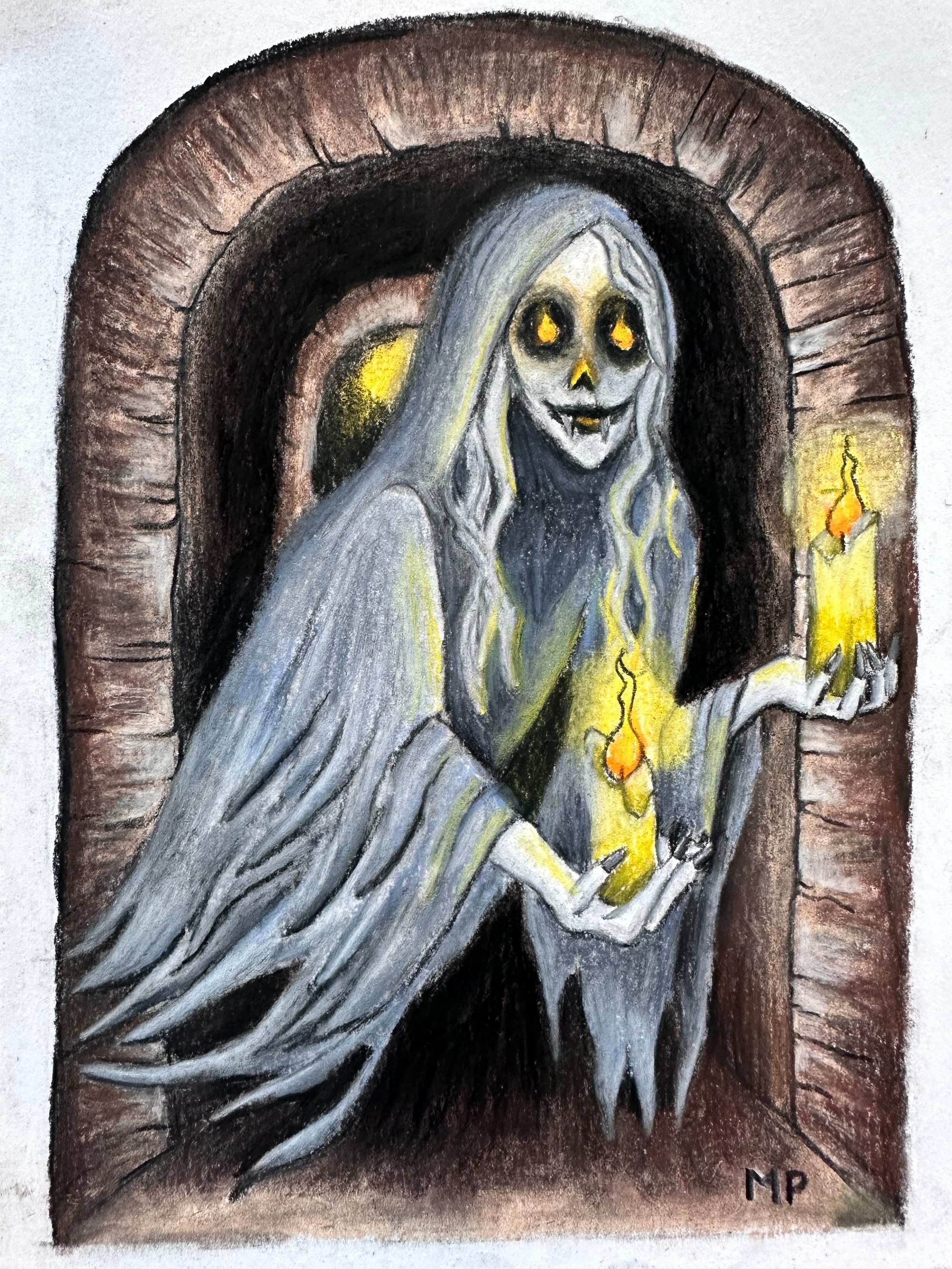 *Close your eyes, count to three, light a candle, then gaze upon me!* This is a ghoul carrying candles as she glides down the hallway she haunts. I drew this pastel piece on heavy multi-media paper, and it comes unframed.