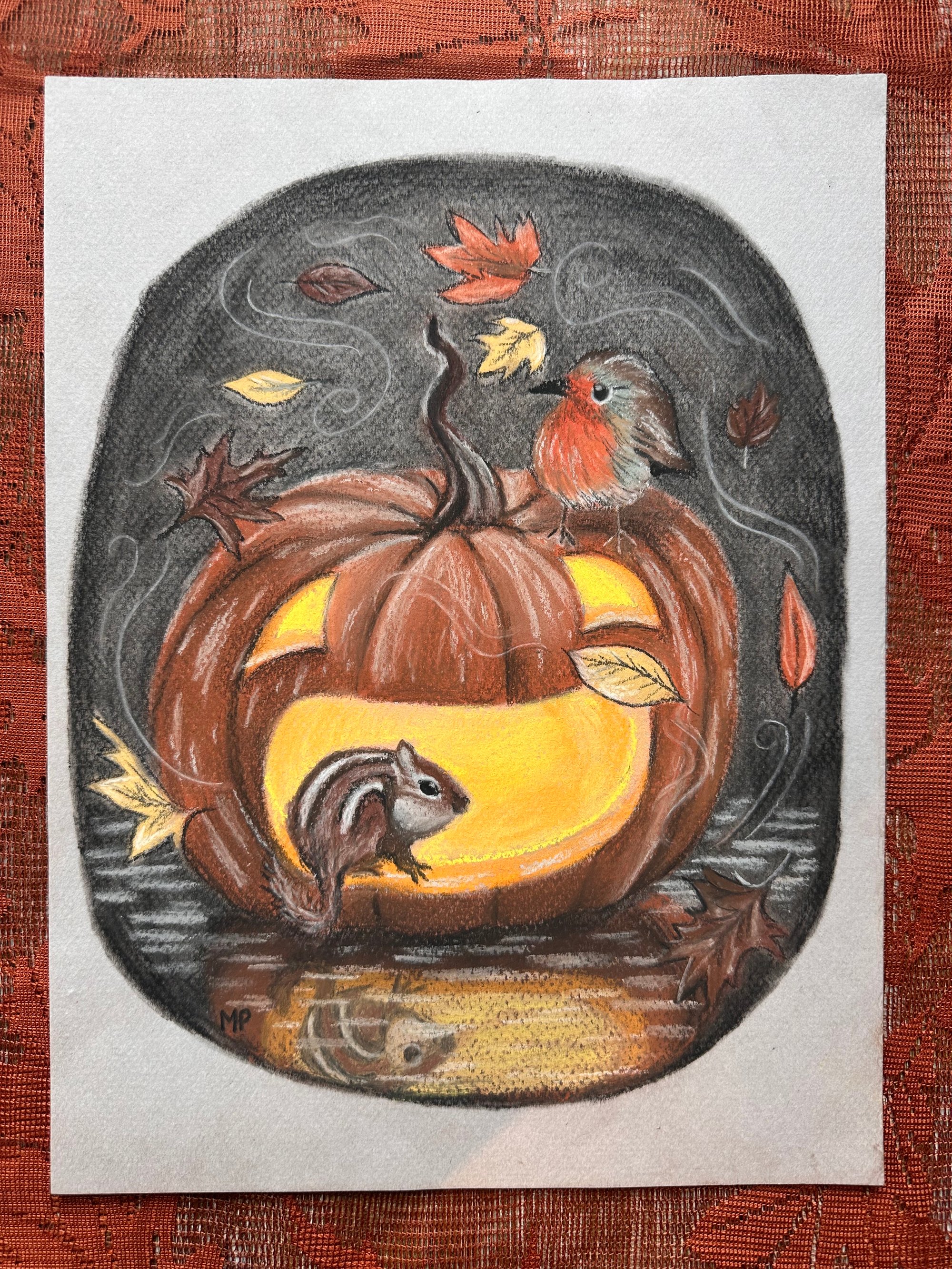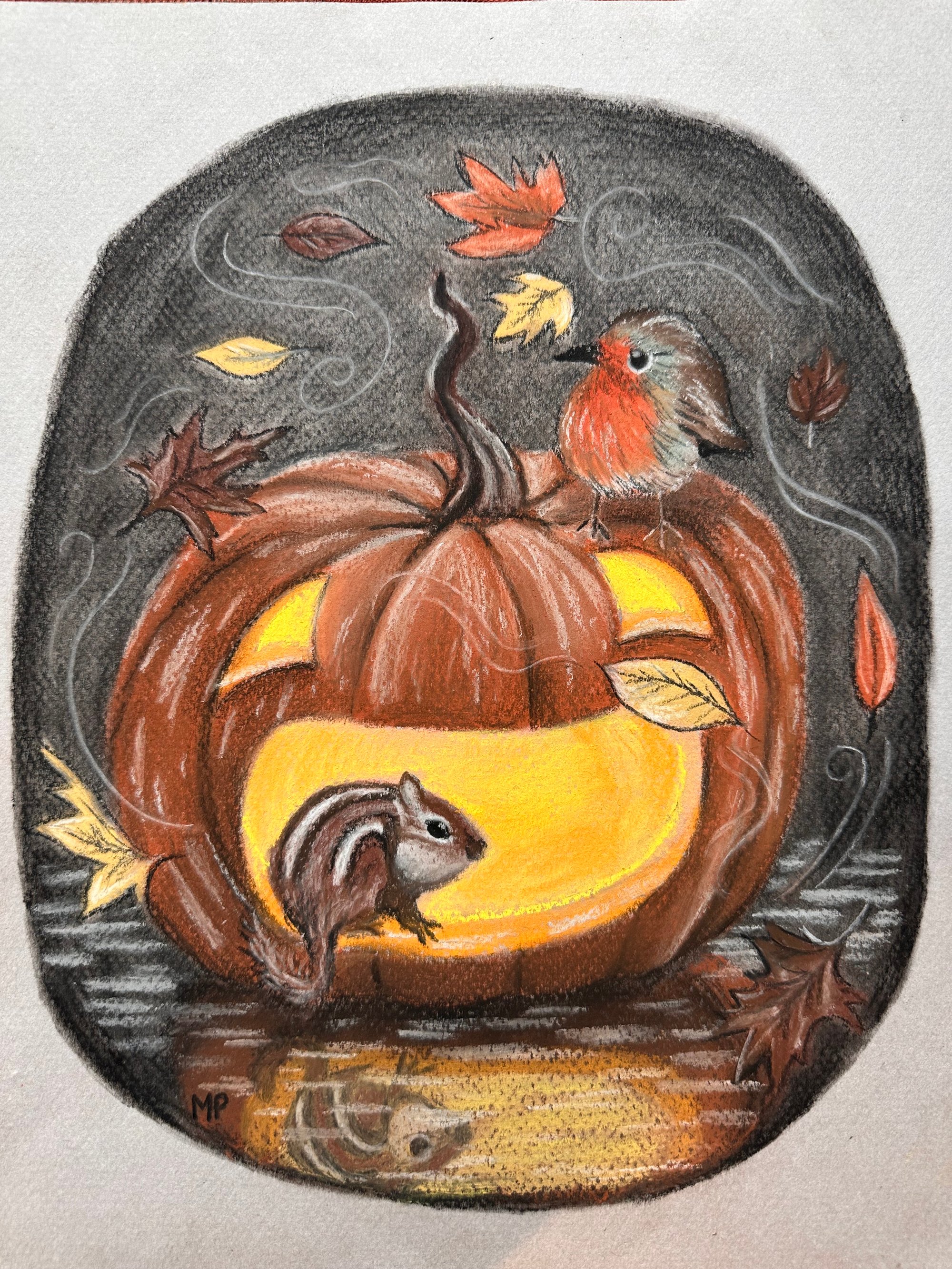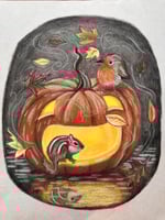Here we have a Jack O' Lantern who a chipmunk and a robin have found to seek shelter from a blustery autumn storm. This pastel piece is drawn on grey-toned pastel paper, and it comes unframed.